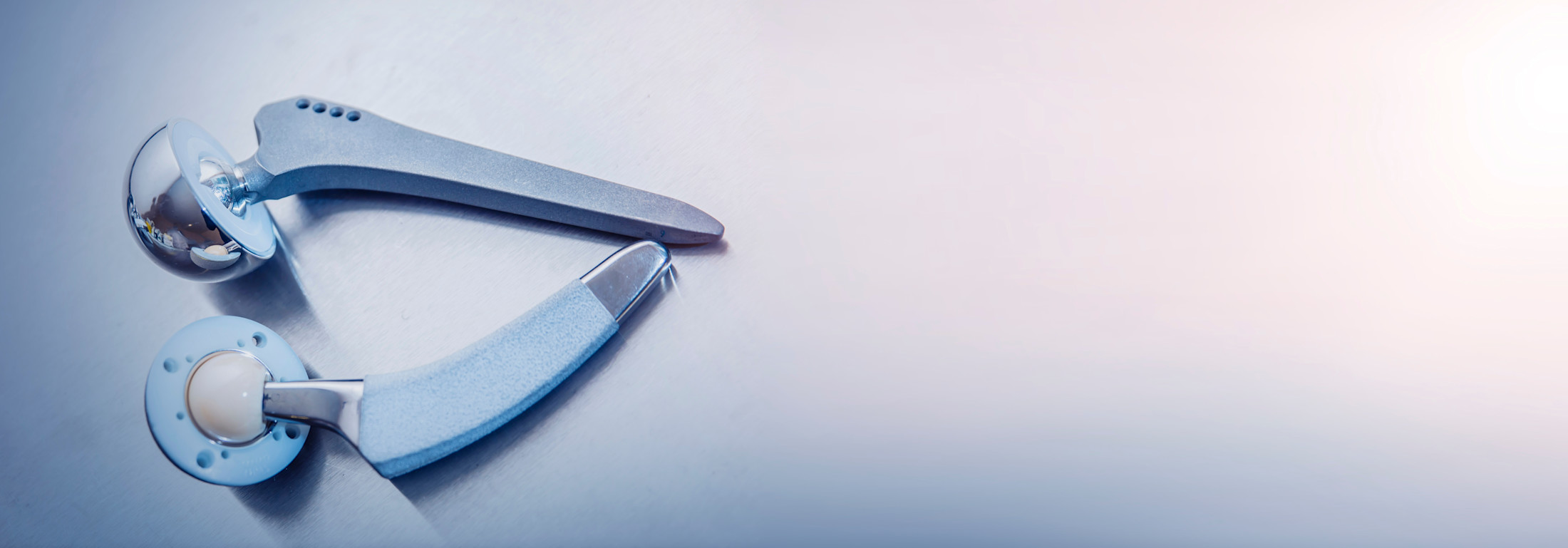 Medical device showing two metallic components of a joint implant on light blue background.